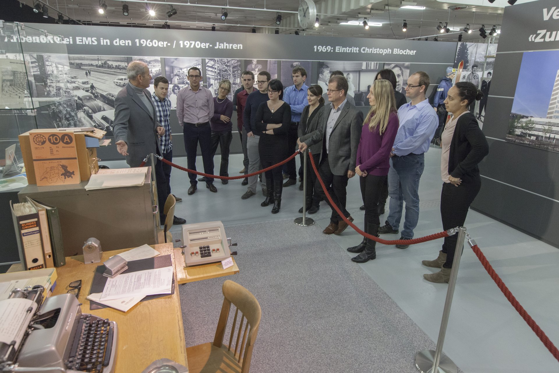 Die imposante Ausstellung wurde anlässlich des 75-Jahre-Jubiläums der EMS-CHEMIE Ende Januar 2011 eröffnet und ist seither für Gruppen auf Voranmeldung öffentlich und unentgeltlich zugänglich. Ehemalige Kadermitarbeiter führen durch die spannende Geschichte und ergänzen sie da und dort mit persönlichen Episoden.
