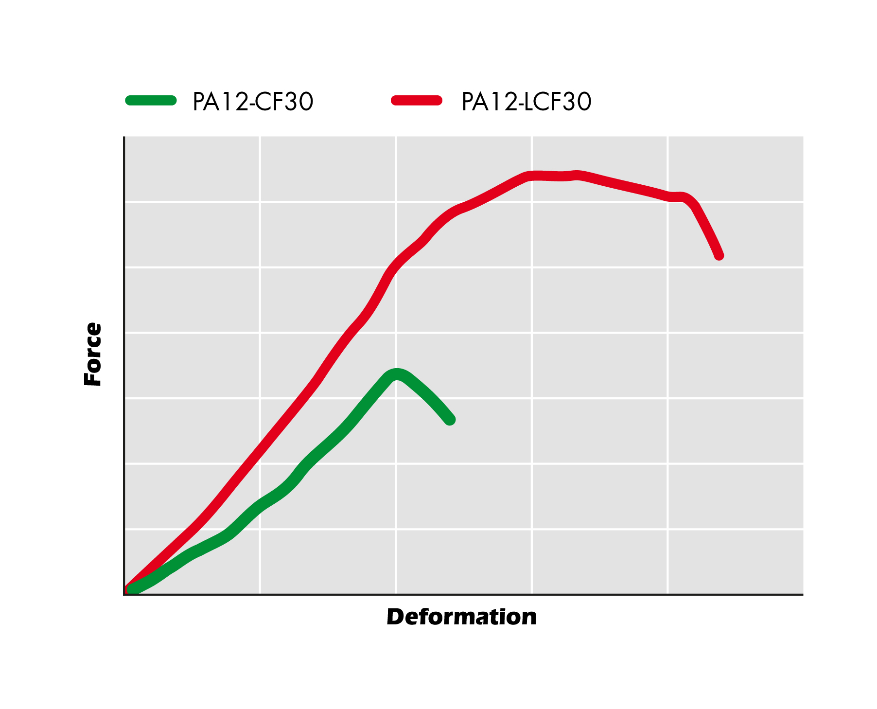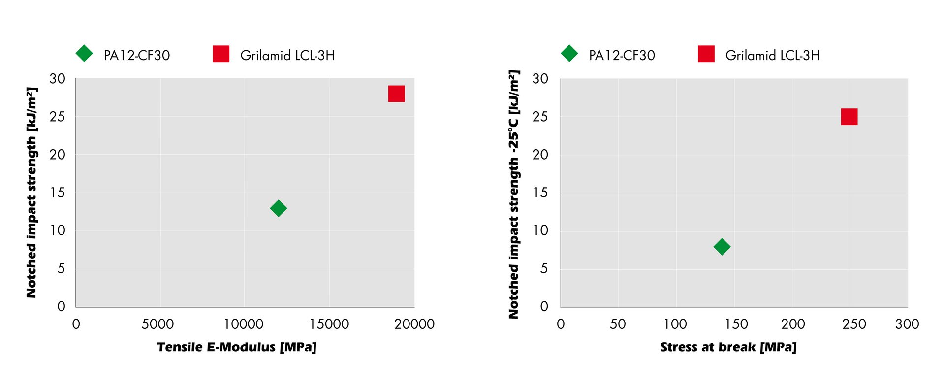 EMS-GRIVORY has expanded the product range of long fibre-reinforced polyamides to five product families: Grivory HT, Grivory GV, Grilamid L, Grilamid TR and Grilon TS. These long fibre-reinforced polyamides show no embrittlement at low temperatures, which makes them very attractive, especially in the field of winter sports. They can be processed on normal commercially available injection-moulding machines and allow fine component structures that are not feasible when using thermoset carbon fibre fabrics. The PA12-based products are characterised by particularly low water absorption which also ensures that their property profile remains constant - a typical feature of PA12.