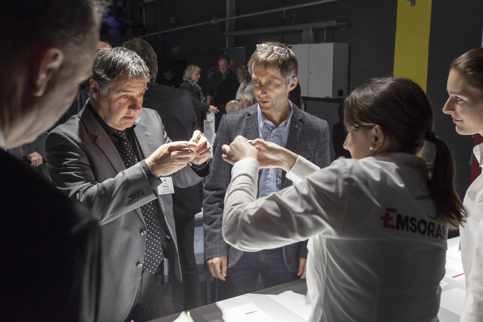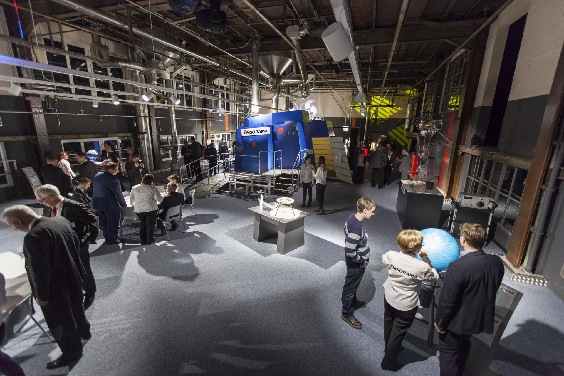 Im Beisein von über 80 faszinierten Gästen konnte die Chefin der EMS-CHEMIE, Magdalena Martullo, zusammen mit dem Regierungsrat Martin Jäger und der Gemeindepräsidentin Beatrice Baselgia am Freitagabend das erste Bündner Science Center EMSORAMA eröffnen.