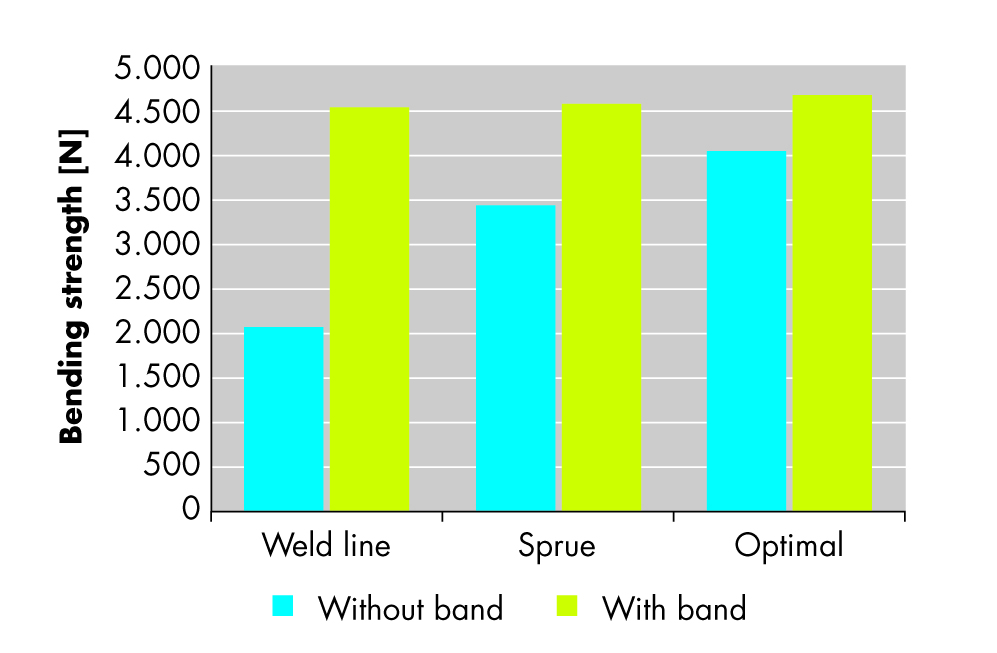 A further new option for light-weight design is the EMS Tape Technology (ETT). This involves oriented endless fibres which are completely impregnated and delivered in the shape of tapes (bands). With their help, for example, a component's weld line strength can be increased massively. In cooperation with the HSR Advanced Technical College at Rapperswil, Switzerland, a technology has been developed for introduction of these tapes into components and, through tests carried out on demonstration parts developed specifically for this purpose, key figures have been compiled. Examination of these findings show that areas around weld lines have up to twice as high strength values when one single tape is applied. The bending strength values achieved were practically independent of the structure of the basic component, with more or less orientation of the fibres or even when weakened by a weld line. Other properties such as creep, long-term, alternating or pulsating fatigue strength were also improved.