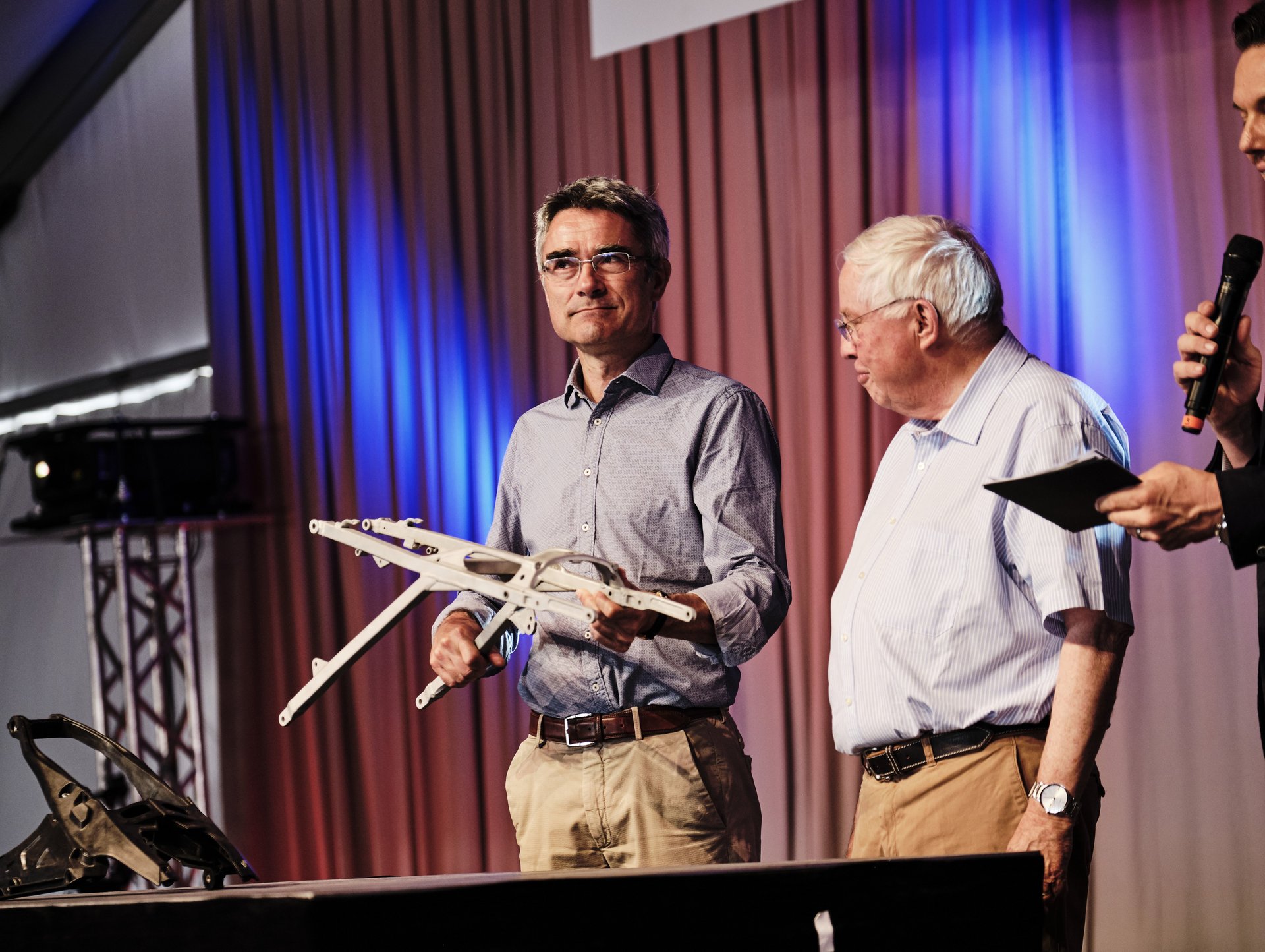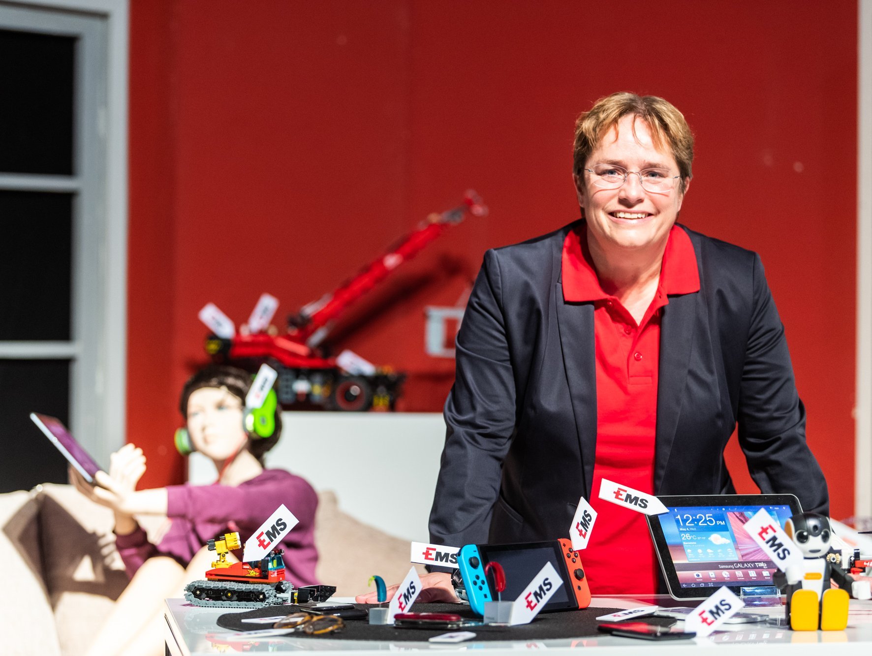 Gespannt ging es dann auf den rund eineinhalbstündigen Rundgang durch die Werksanlagen: Nach einer kurzen Zeitreise durch die mittlerweile 83-jährige Geschichte von EMS bestaunten die Besucher auf 1'500 Quadratmetern über 3'000 hochinnovative Anwendungen aus EMS-Spezialkunststoffen – von hochtemperaturbeständigen Automotorbestandteilen, über ultraleichte Fahrradkomponenten bis zum Spielkameraden und Multimedia-Roboter "Robi". Überall steckt Kunststoff aus Graubünden drin! Weiter ging es durch das hochmoderne EMSer Entwicklungszentrum, vorbei an den Rohstoffentladungsstationen, entlang unzähliger Rohrleitungen, durch weitläufige Produktions- und Verpackungsanlagen bis zum weltweit dritthöchsten Hochregallager, von wo aus die EMS-Spezialkunststoffe in alle Welt verschickt werden.