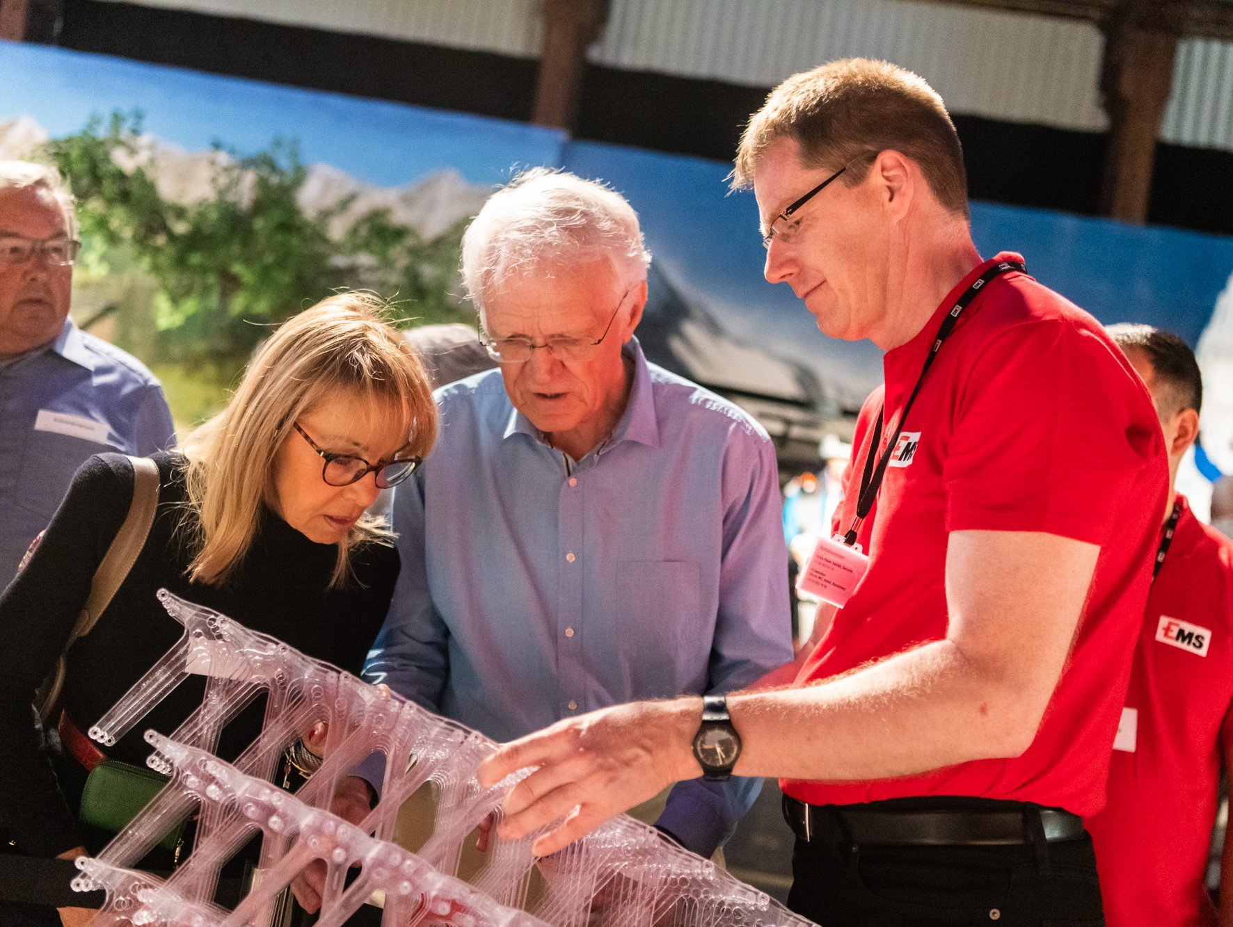 Daneben gab es allerlei Fakten und neue Aspekte über das innovative Traditionsunternehmen zu erfahren: Wussten Sie, dass EMS jährlich 15 Millionen Franken in Umweltschutz und Sicherheit investiert und den Energieverbrauch seit 2001 um fast 50% reduzierte? Oder dass EMS-Kunststoffe nur halb so schwer aber genauso robust wie Metall sind und bis zu 10x rezykliert werden können? Oder dass in der EMS-Produktion 400 Säcke Kunststoffgranulat pro Stunde abgefüllt und per Bahn nach Rotterdam und per Schiff nach Asien transportiert werden? Kein Wunder, dass die EMS-Mitarbeiter und -Lernenden "ihren" Werkplatz auf dem Rundgang voller Stolz präsentierten und über ihre vielfältigen Tätigkeiten und zukunftsträchtigen Ausbildungen berichteten.