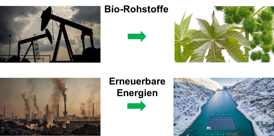 EMS setzt auf innovative Technologien und nachhaltige Prozesse, um den Anteil nachhaltiger Materialien in seinen Produkten kontinuierlich zu steigern. Dies kann auf mehrere Wege geschehen: Einsatz von Bio-Rohstoffen, Einsatz von Rohstoffen, die mit nachhaltiger Energie produziert wurden und mit Recycling Materialien (chemisch und mechanisch). (Bild 3: Möglichkeiten zur Produktion nachhaltiger Produkte)