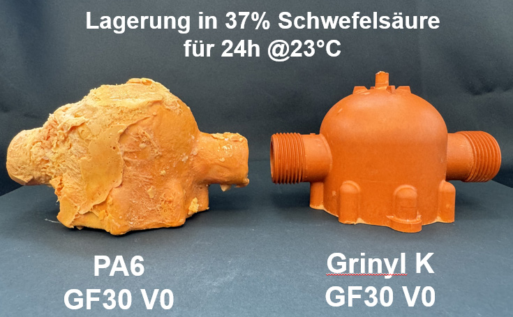 Die beeindruckend Chemikalienbeständigkeit von Grinyl K ist beispielhaft durch die Lagerung in Batteriesäure aufgezeigt.
