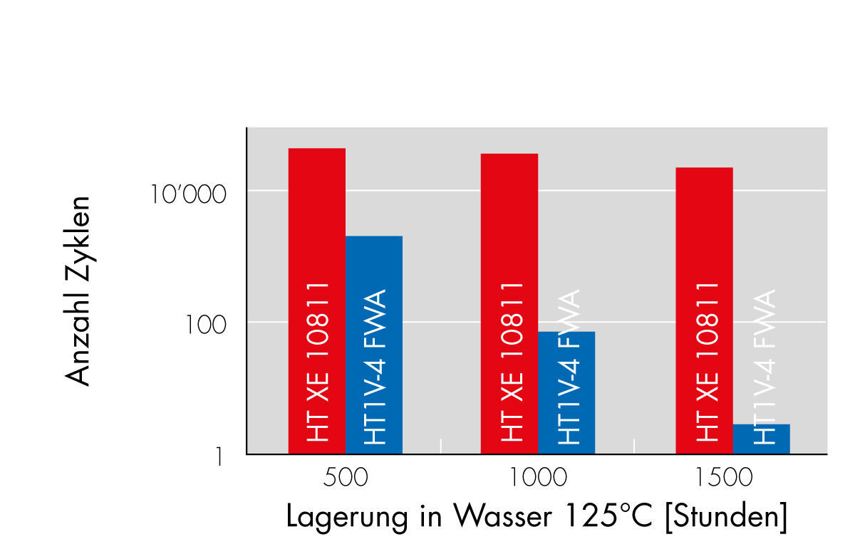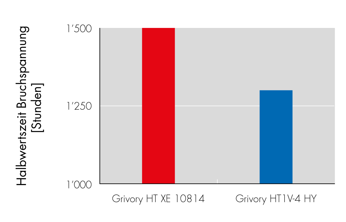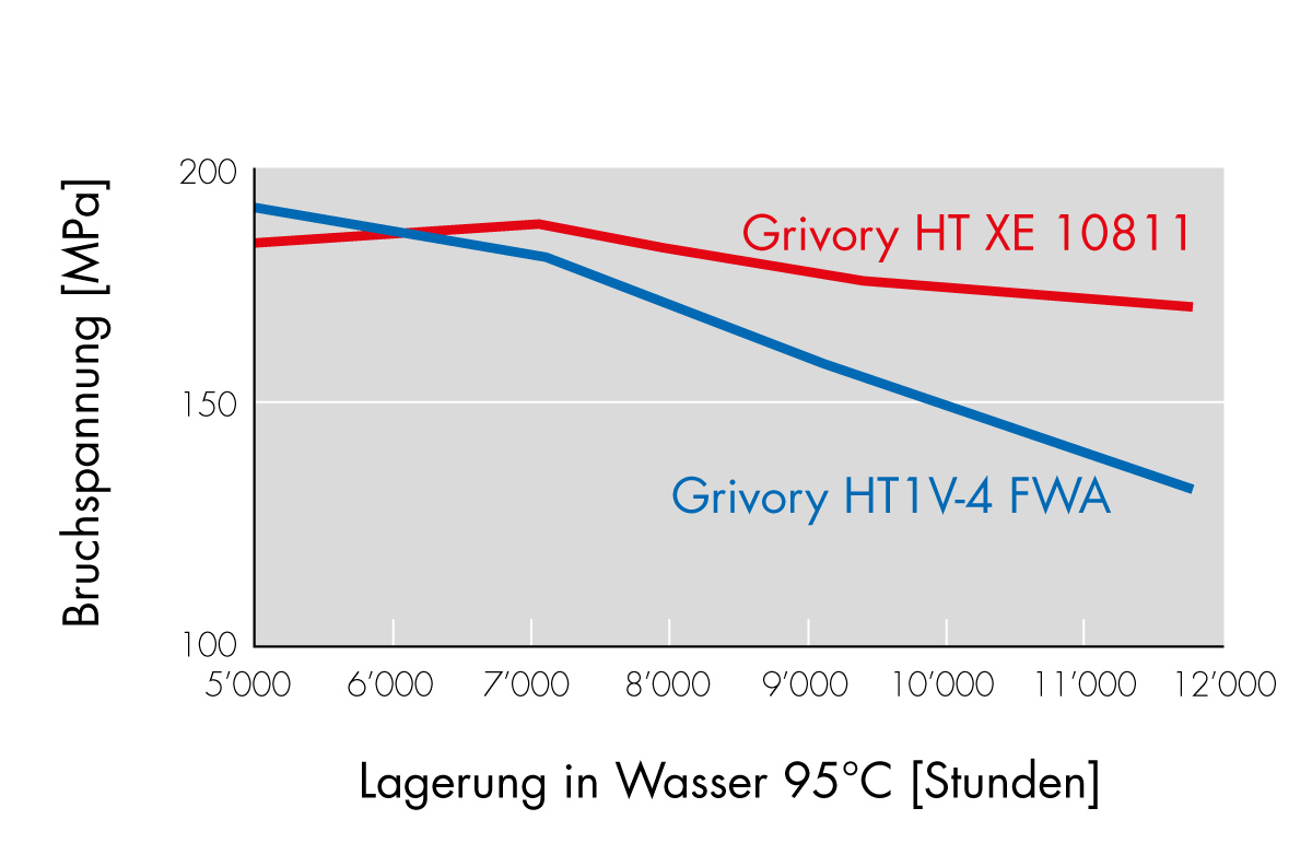 Die neuen Grivory HT Produkte sind eine Weiterentwicklung der Grivory HT1V FWA und Grivory HTV-HY Typen und ermöglichen die Realisierung von Anwendungen in Heisswasser oder Dampf sowie Wasser-Glykolgemisch mit noch höheren Betriebstemperaturen bzw. längeren Lebensstandzeiten (Siehe Diagramme 1 und 2). Gleichzeitig wurde die Ermüdungsfestigkeit an der Bindenaht verbessert (siehe Diagramm 3). Die Zähigkeit und Verarbeitbarkeit sind vergleichbar mit den bekannten Produkten Grivory HT1V FWA und Grivory HTV-HY.