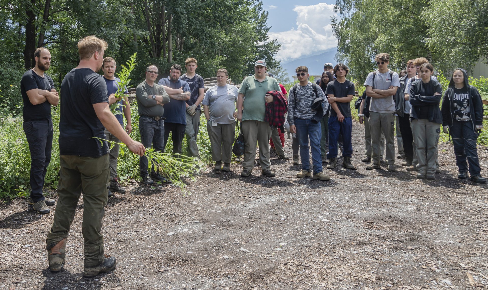 Untervaz liegt südlich von Chur auf der linken Seite des Bündner Rheintals und schmiegt sich harmonisch, am Fusse des Calanda, in den Winkel des Val Cosenz. Rund 2'000 Arbeitsstunden leisteten die EMS-Lernenden zugunsten der Bevölkerung: In Gruppen von 10 Lernenden und unter fachkundiger Anleitung der Untervazer Forstmitarbeiter verbreiterten die EMSer in der ersten Wochenhälfte Wanderwege westlich des Rheins Richtung Haldenstein. Mit Hacken und Pickel ausgerüstet, entfernten sie Wurzeln und Gestrüpp, erstellten Treppenstufen und stampften den Untergrund wieder fest. Auch der beliebte Waldlehrpfad oberhalb Untervaz wurde an den Rändern von Gras befreit und wieder begehbar gemacht. In einem naturgeschützten Waldstück bei der Au wurden invasive Neophyten (gebietsfremde Pflanzen, welche einheimische Pflanzen verdrängen) ausgerissen und entsorgt. Gleichzeitig wurde herumliegender Abfall eingesammelt. Die letzten beiden Lagertage verbrachten die EMS-Lernenden auf der Hinteren Alp, wo sie im Brunaboden Weideflächen von alten Ästen befreiten.