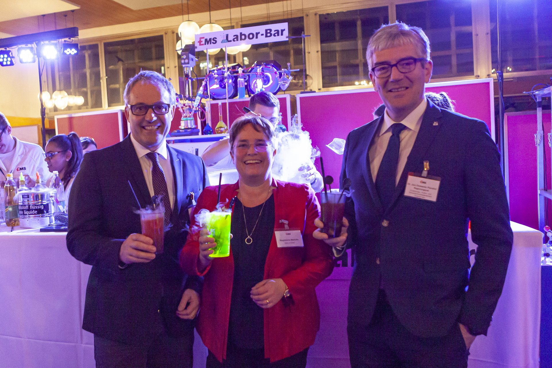 Verpflegt wurden die Gäste gleich von den Lernenden selber, welche aus der EMS-Labor-Bar geheimnisvolle Drinks ausschenkten. Beim nachfolgenden Besuch des EMSORAMA konnten sich die Gäste dann gleich persönlich von Naturwissenschaften und Technik begeistern lassen. So wurde an der neuen Riesenkugelbahn "Mungga-Trail", dem "Torbogen" oder der "Impulsschleuder" fleissig experimentiert, gestaunt, bewundert und gelacht. Irgendwo und irgendwie ist halt jeder auch ein "Lehrling"…
