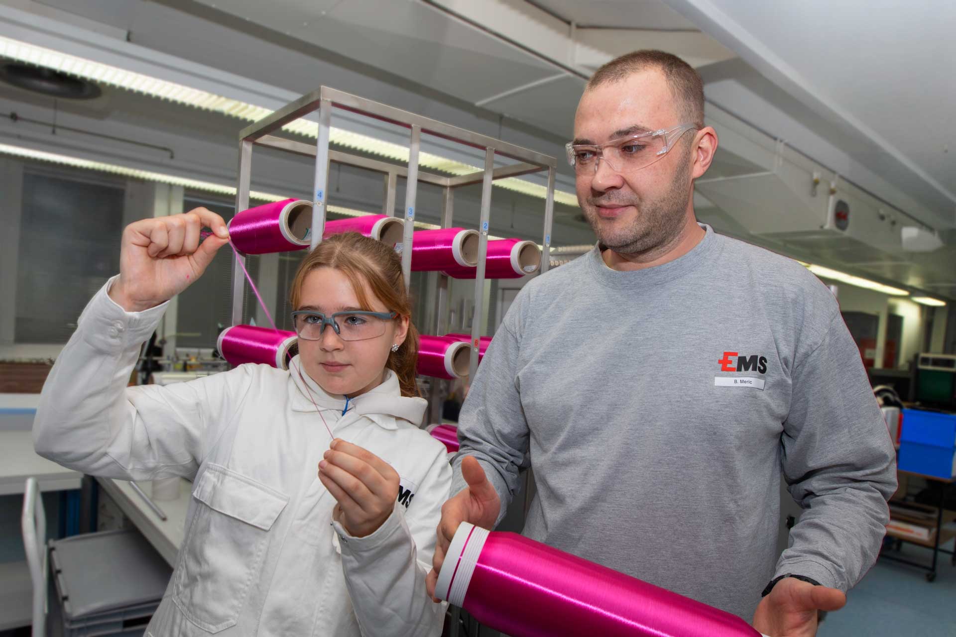 So testete etwa Alina mit ihrem Vater Bahrudin Meric im Fasertechnikum die Dehnbarkeit der EMS-Spezialfasern, während Mia mit ihrem Götti Adrian Camenisch eine hübsche Rose aus Metall fertigen durfte. Besonders cool fand es Kiumars, gemeinsam mit seiner Mutter Christiane Busch in die farbenfrohe Welt eines Chemielabors einzutauchen. Natürlich bleibt der Zukunftstag auch für die Eltern und Bekannten in besonderer Erinnerung: «Es war beeindruckend zu sehen, wie geschickt Leandro Faustinoni – ein Mitschüler meiner Tochter – schon mit dem Metallbohrer umgehen kann. Schon fast so gut wie die Lernenden im Lernenden Anlagen-Apparatebauer», meinte Aleksandar Sarcevic, Berufbildner Anlagen- und Apparatebauer schmunzelnd.