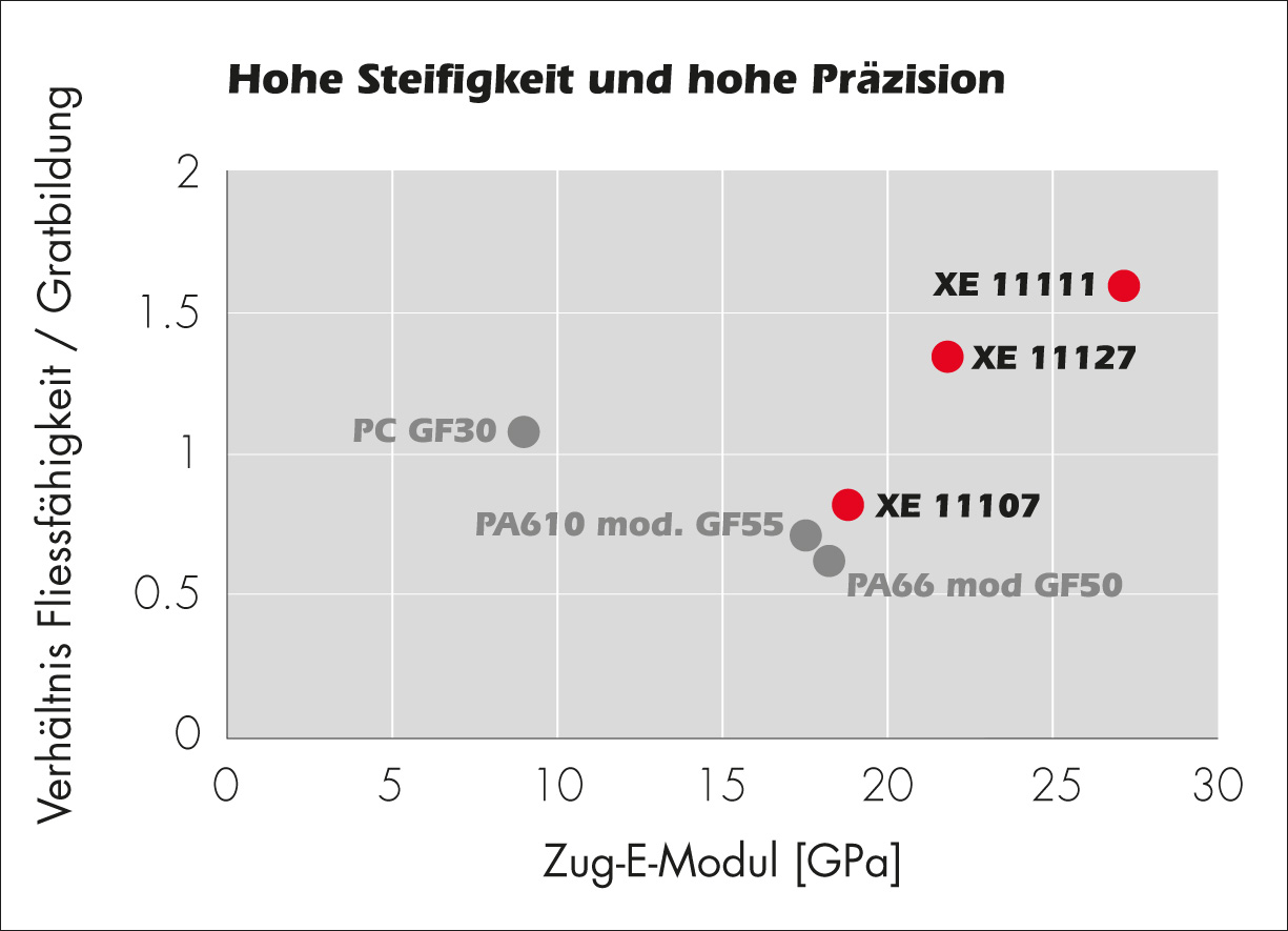 Grivory G6VX-AP (Advanced Performance) – die neue Generation Hochleistungspolyamide für hochpräzise Bauteile – zeichnet sich durch eine aussergewöhnliche Steifigkeit und Schlagzähigkeit bei gleichzeitig hoher Dimensionsstabilität aus.