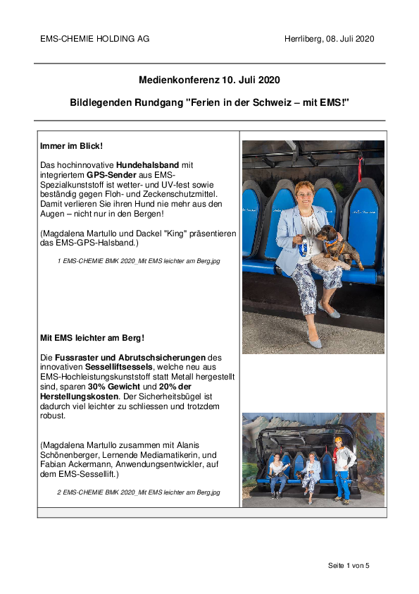 Die EMS-Gruppe, die in den Geschäftsbereichen Hochleistungspolymere und Spezialchemikalien weltweit tätig ist und deren Gesellschaften in der EMS-CHEMIE HOLDING AG zusammengefasst sind, erzielte im 1. Halbjahr 2020 einen Nettoumsatz von CHF 849 Mio. (1'154) und ein Betriebsergebnis (EBIT) von CHF 229 Mio. (316). Die Nettoliquidität stieg von CHF 696 Mio. am 31. Dezember 2019 auf CHF 864 Mio.