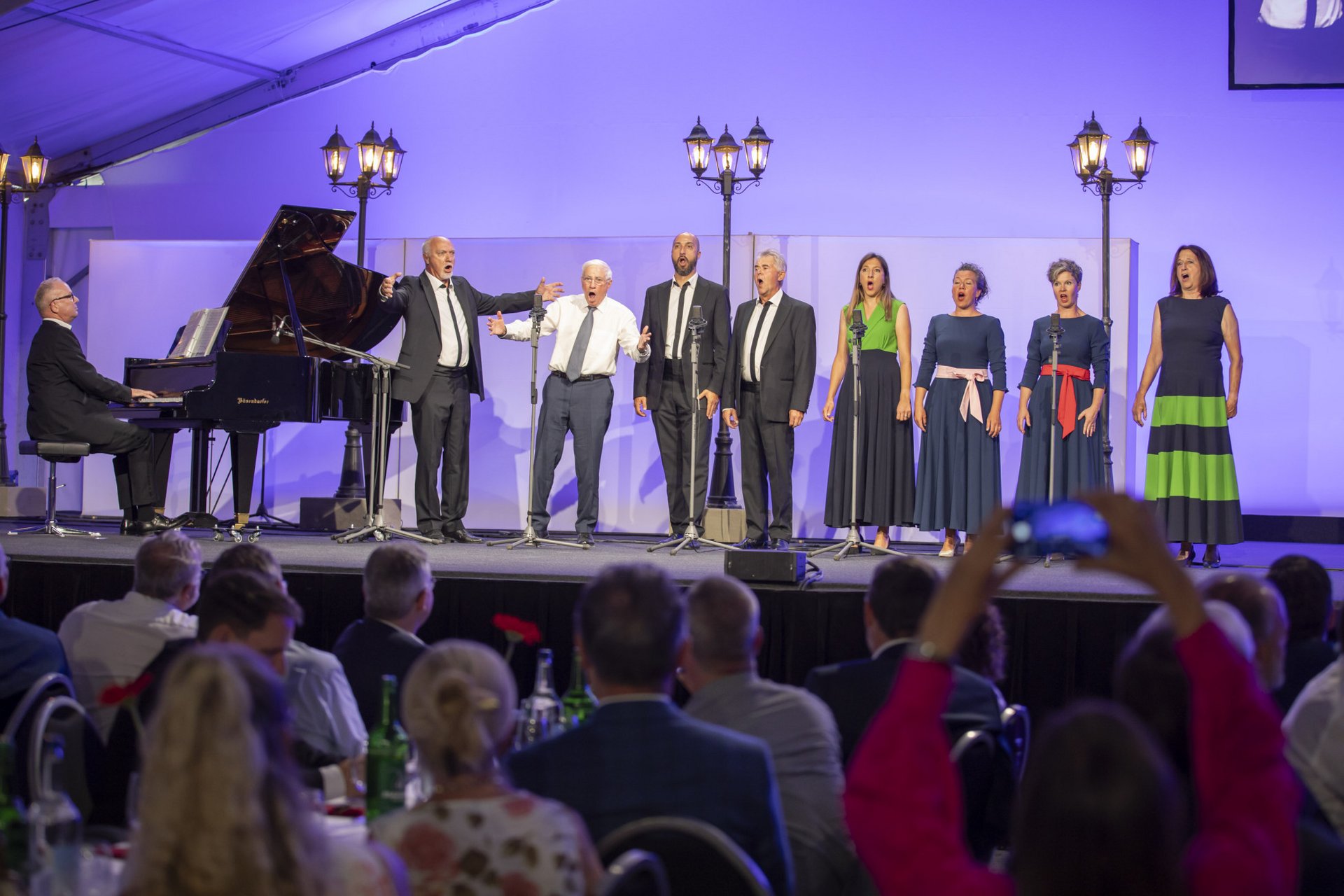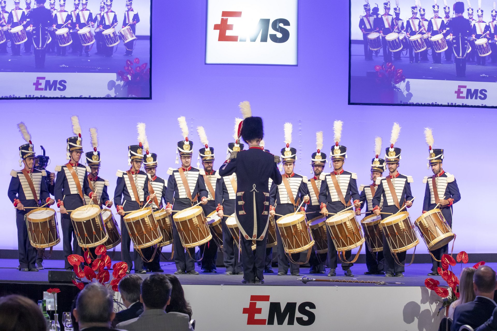 The full-voiced vocal ensemble La Compagnia Rossini, directed by Armin Caduff, inspired the Annual General Meeting with cheerful and melodic romanic folk songs. For the encore, they called EMS Honorary Patron and former Federal Councilor Dr. Christoph Blocher on to the stage for a vocal reinforcement. As is tradition, the finale to the extensive Annual General Meeting program was provided by the drum corps Domat/Ems in historic uniforms and led by Drum Major Leandro Spescha.