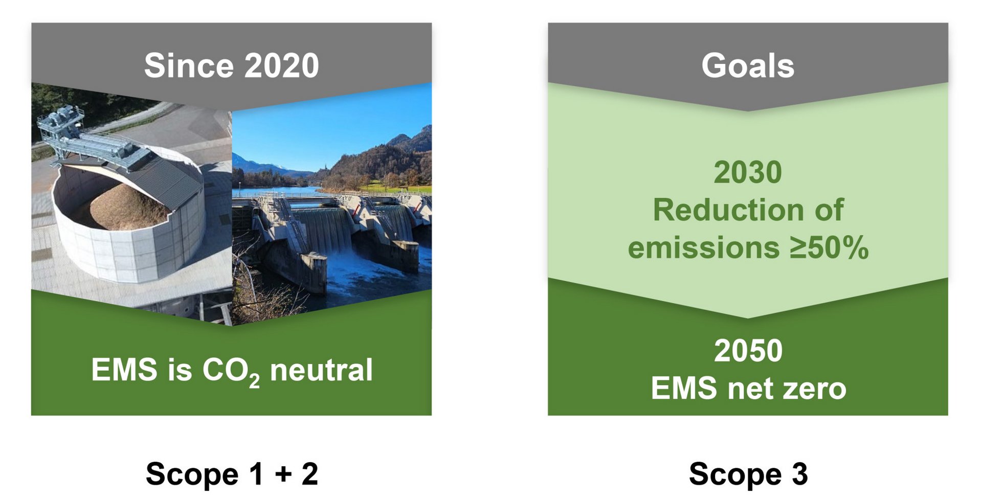 EMS is pursuing ambitious sustainability goals: The company has been CO2 neutral for Scope 1 and Scope 2 since 2020, as confirmed by the DFGE (Institute for Energy, Ecology and Economy) with regard to the Greenhouse Gas Protocol. EMS plans to reduce its Scope 3 emissions by at least 50% by 2030 and, in order to make an active contribution towards combating climate change, is aiming for net zero emissions by 2050. (Fig. 2: EMS' goals)
