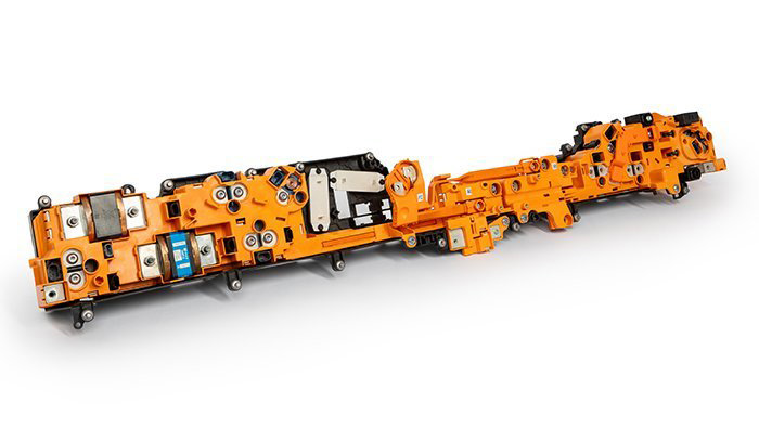 The covers of the busbars are made of Grilon TS V0. This non-reinforced specialty polymer allows components to be clipped together fully automatically. The extruded busbars are coated with a layer of Grilamid XE 3817, which was specially developed for adhesion to metals. Thanks to the very good elasticity and adhesion of the EMS specialty polymer, no detachment occurs during the 3D forming process. The material also has excellent resistance to ageing over 3,000 hours at up to 125°C. All components are mounted on a 1.2 m long structural bracket, which is made from very easy-flowing Grilon BG-30 S.