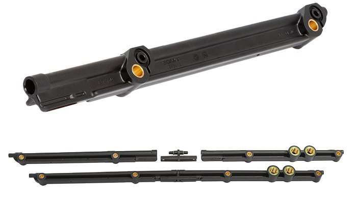 Scania has developed an innovative return line for V8 diesel engines made of high temperature resistant Grivory HTV-4H1. Weight savings of 85% with an unchanged long working life are achieved by replacing aluminum with this polymer. In this way, the component weight has been reduced from approx. 2.3 kg to only 0.35 kg. Each Scania V8 engine has two of these return lines, providing savings potential of approx. 4 kg of empty vehicle weight. The return lines are designed in such a way that they ensure a 20-year maintenance-free working life of the truck under temperatures fluctuating between